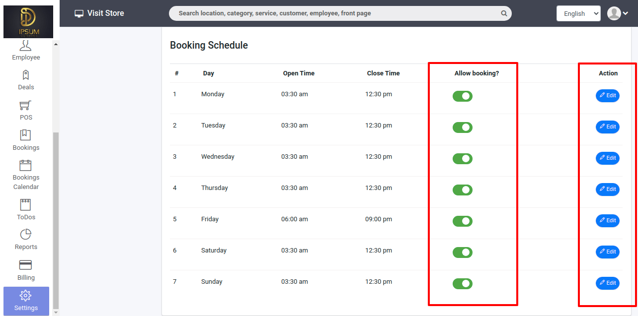 Enable a booking schedule for your company to get online bookings. Suppose you don’t want to get bookings on Sunday then you have to disable bookings for that day from Booking Schedule->Allow Booking for Sunday.