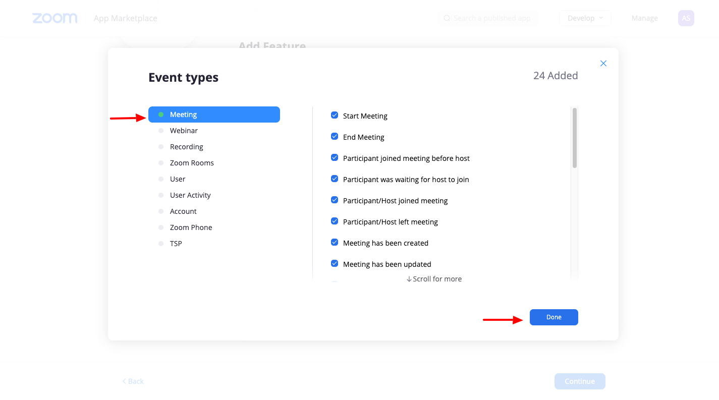 10. Click the Add events button and select all the events for Meetings