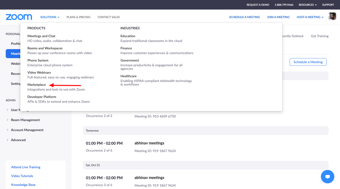 1. Log in to your zoom account and go to Marketplace from the Solutions menu dropdpwn