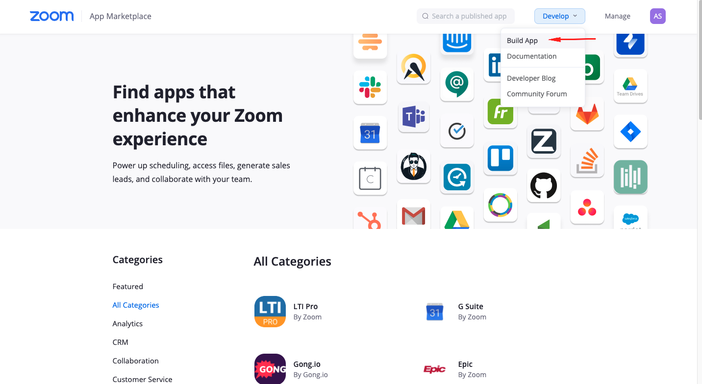2. On the marketplace page, select Build App from the Develop dropdown