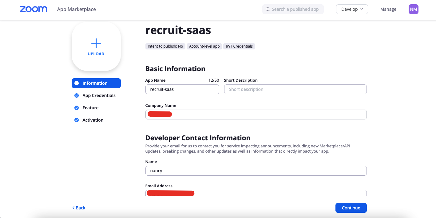5. Add information for the app and click Continue