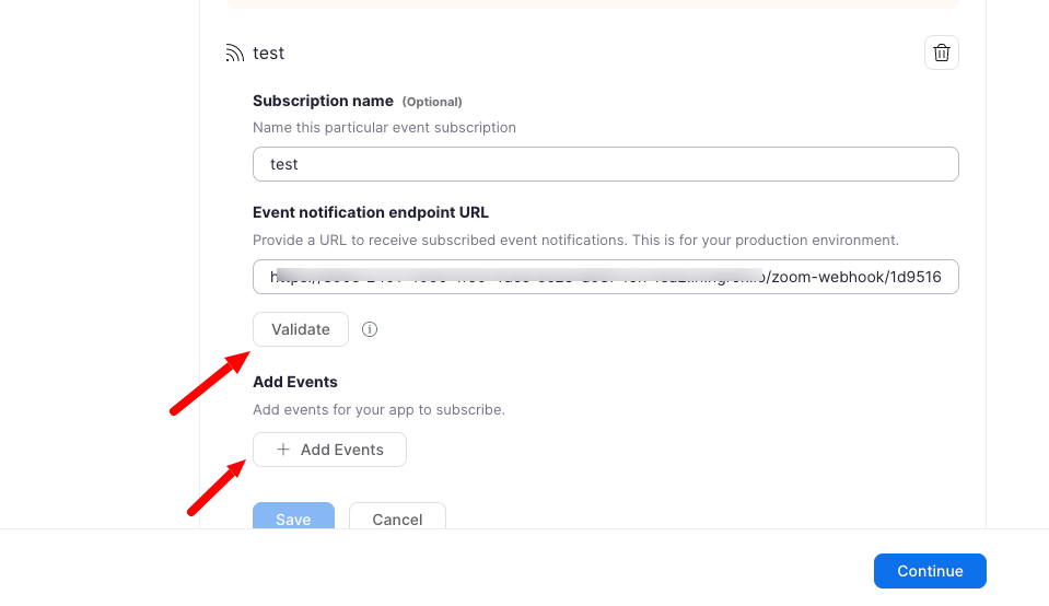 9. Add event subscription details and add webhook url in event notification endpoint url and click on validate .