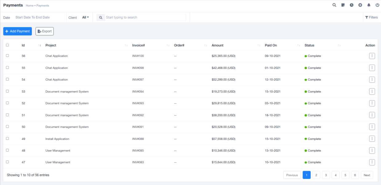 The payments section is mainly responsible for recording all the transactions made to the organization by the clients. The data is recorded in a tabular format for convenience. It records details such as the concerning project, invoice number, order number, amount, payment date, the status of payment along with editing, viewing, and deleting options. The data can be filtered depending on the project name, or status of the payment.