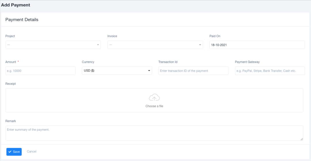 Each payment detail is viewed individually where details such as the amount, payment date, invoice, project, transaction id, payment status, and additional details are available. These are viewed using the view option available in the drop-down menu accessed from the three dots on the right end.