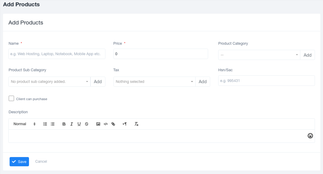 Using the "Add Product" option on the top left corner, one can easily add new products to the list formed. In the pre-generated form, it is easy to feed in details as asked. After all the details are added in the given slots, save the details and add them to the list for the client's usage.