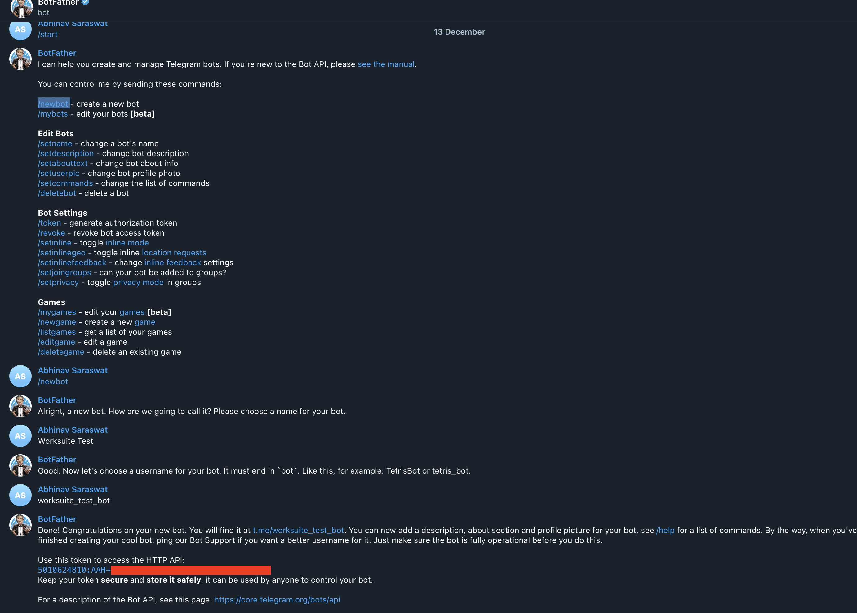 - Write /newbot in message field and send the message