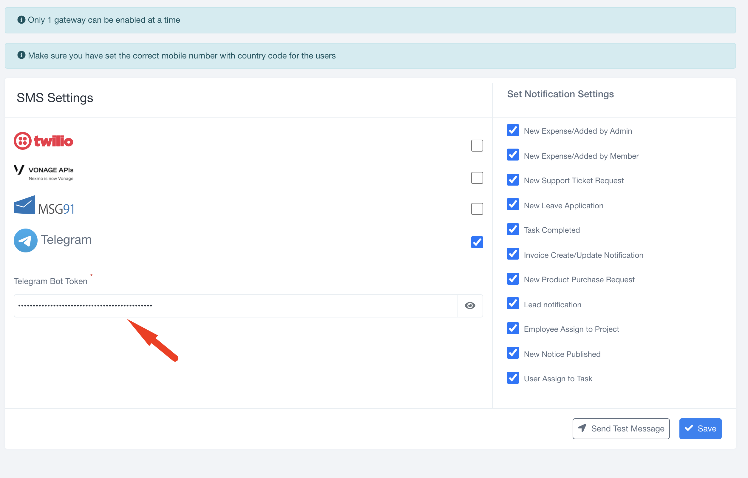 Save the Bot Token in Telegram Settings Under SMS Settings