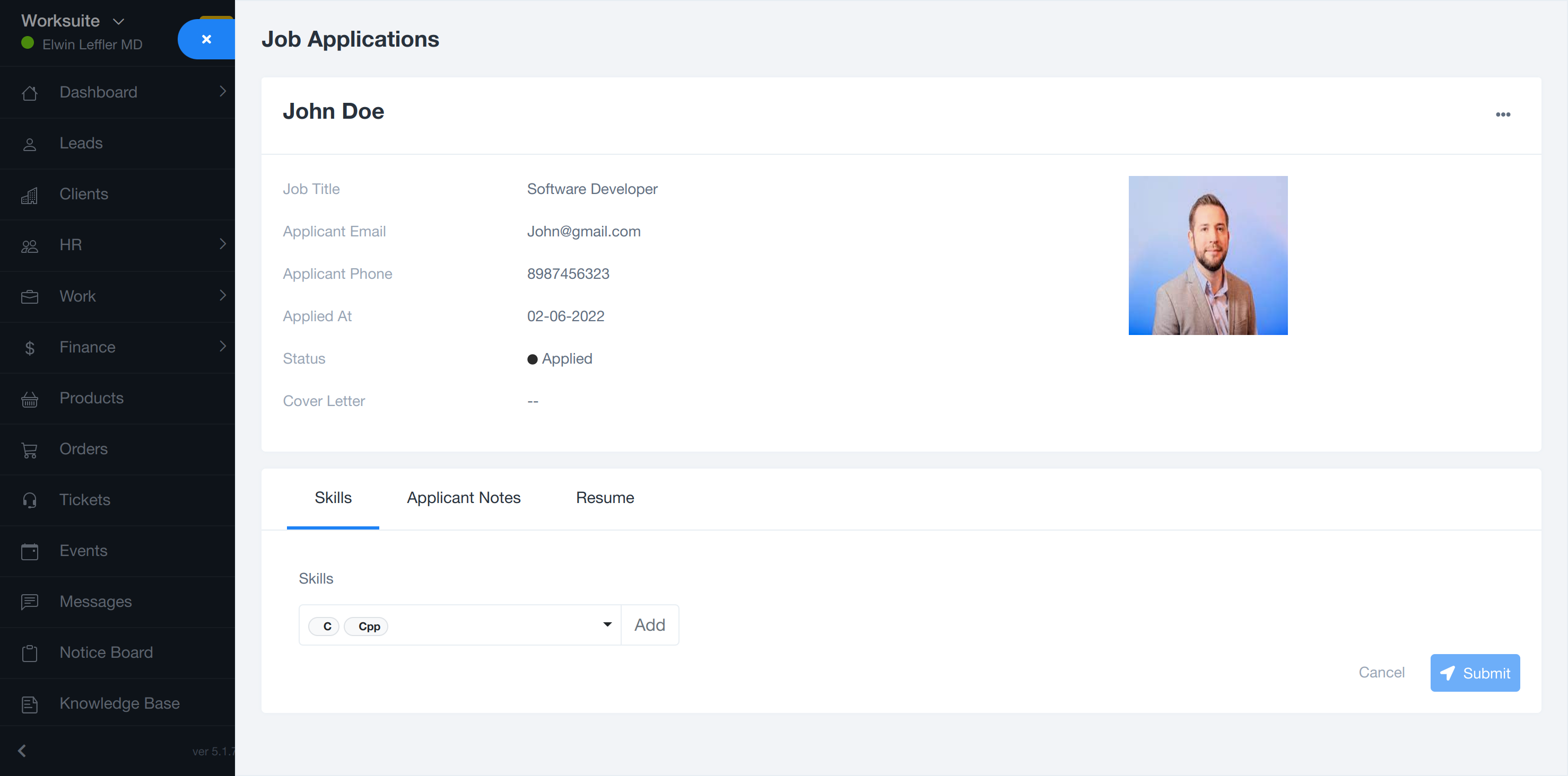here you can add skills, applicant notes, and resume of the applicant.