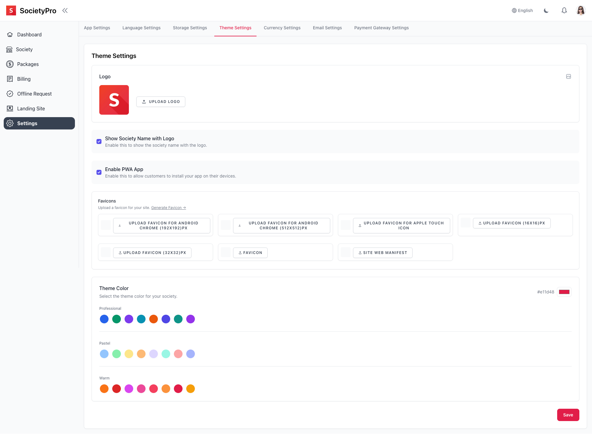 The Theme Settings Module in SocietyPro allows administrators to customize the appearance of their site. Users can upload a logo, configure favicons, enable Progressive Web App (PWA) support, and select a theme color to match their brand identity.