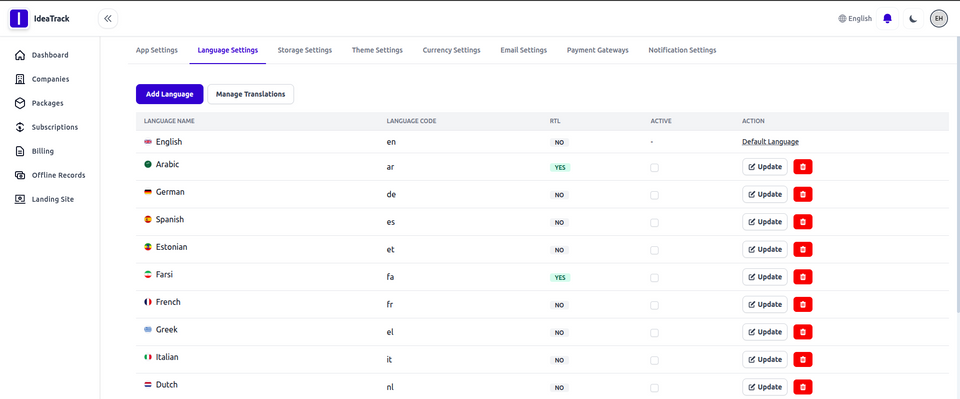 Add new languages, manage translations, and set the default language for your platform. You can enable or disable languages.