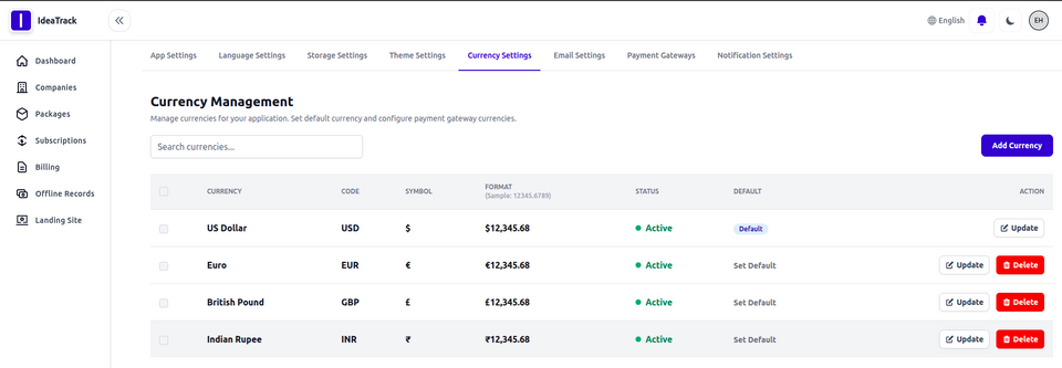 Currency Settings allow you to choose your preferred currency and format it across the entire platform for consistent pricing and display.