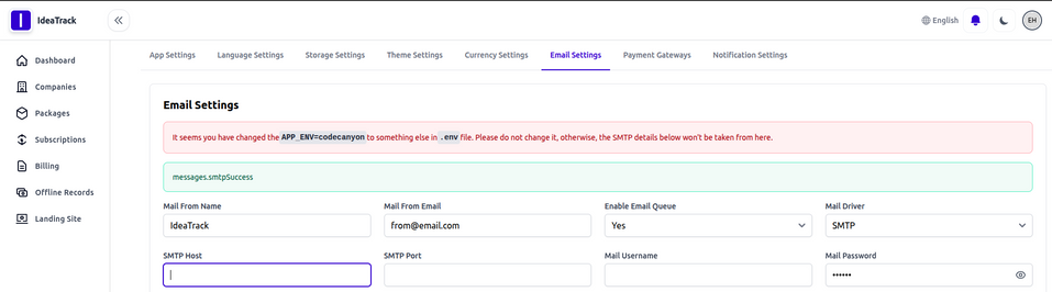 configure your SMTP details to ensure all system emails are delivered reliably from your platform.