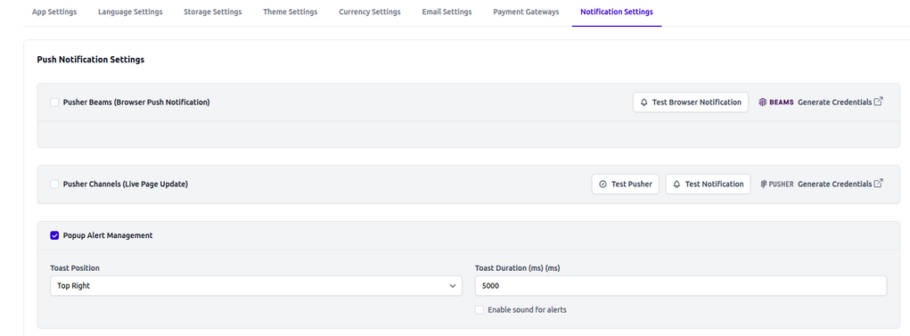 Configure real-time alerts using Pusher and manage in-app notifications through Beamer to keep users instantly updated.