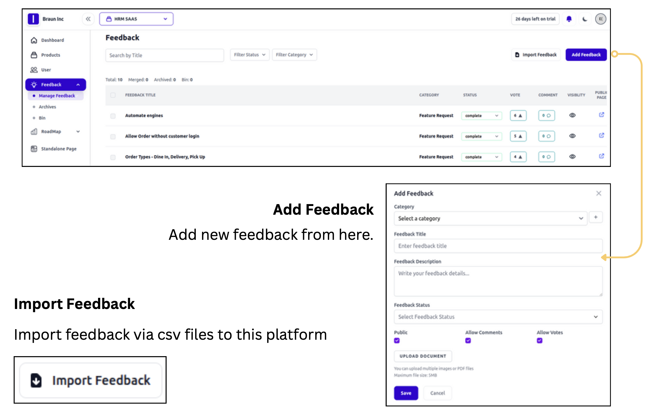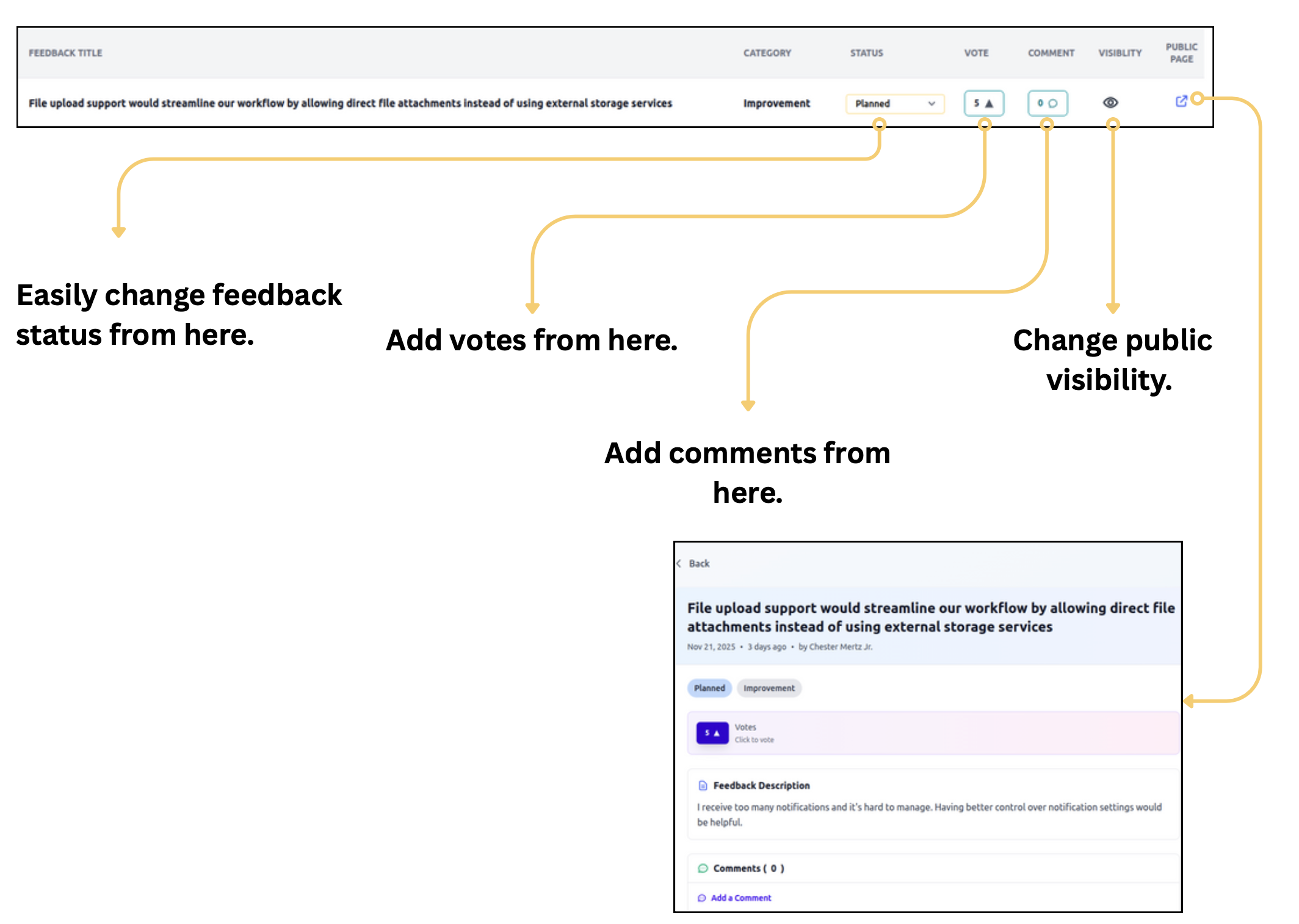 Manage Feedback lets you view, organize, and act on all user ideas, suggestions, and reports to keep your product improvement on track.
