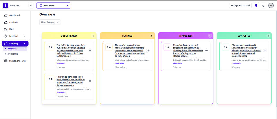 Easily navigate through the feedback by drag and drop, switch between statuses, view feedback details and add votes.
