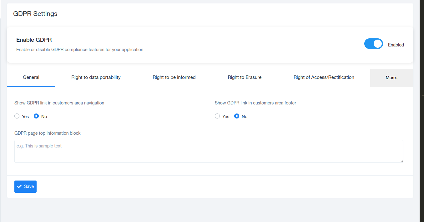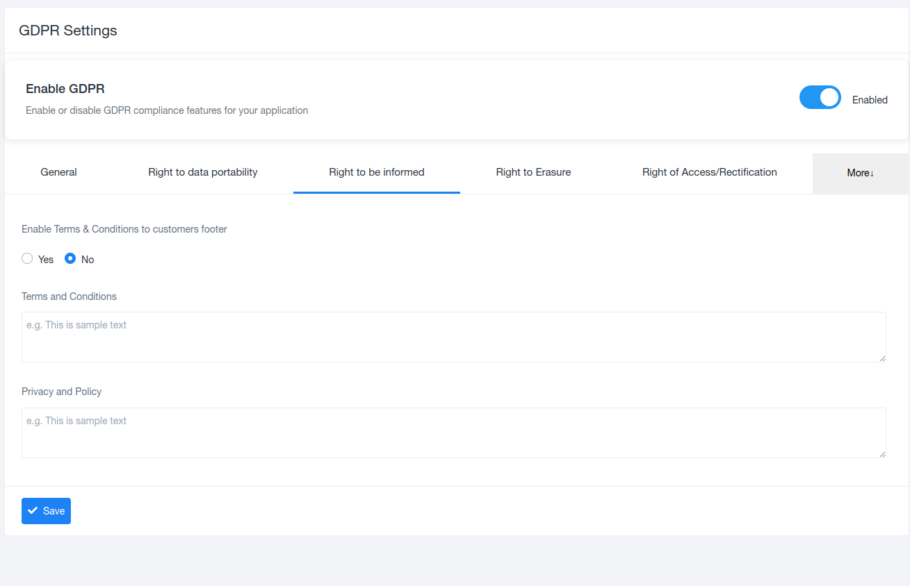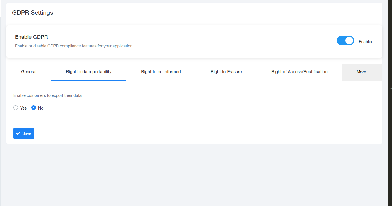 Admins can enable or disable GDPR compliance for the entire application using the Enable GDPR toggle.