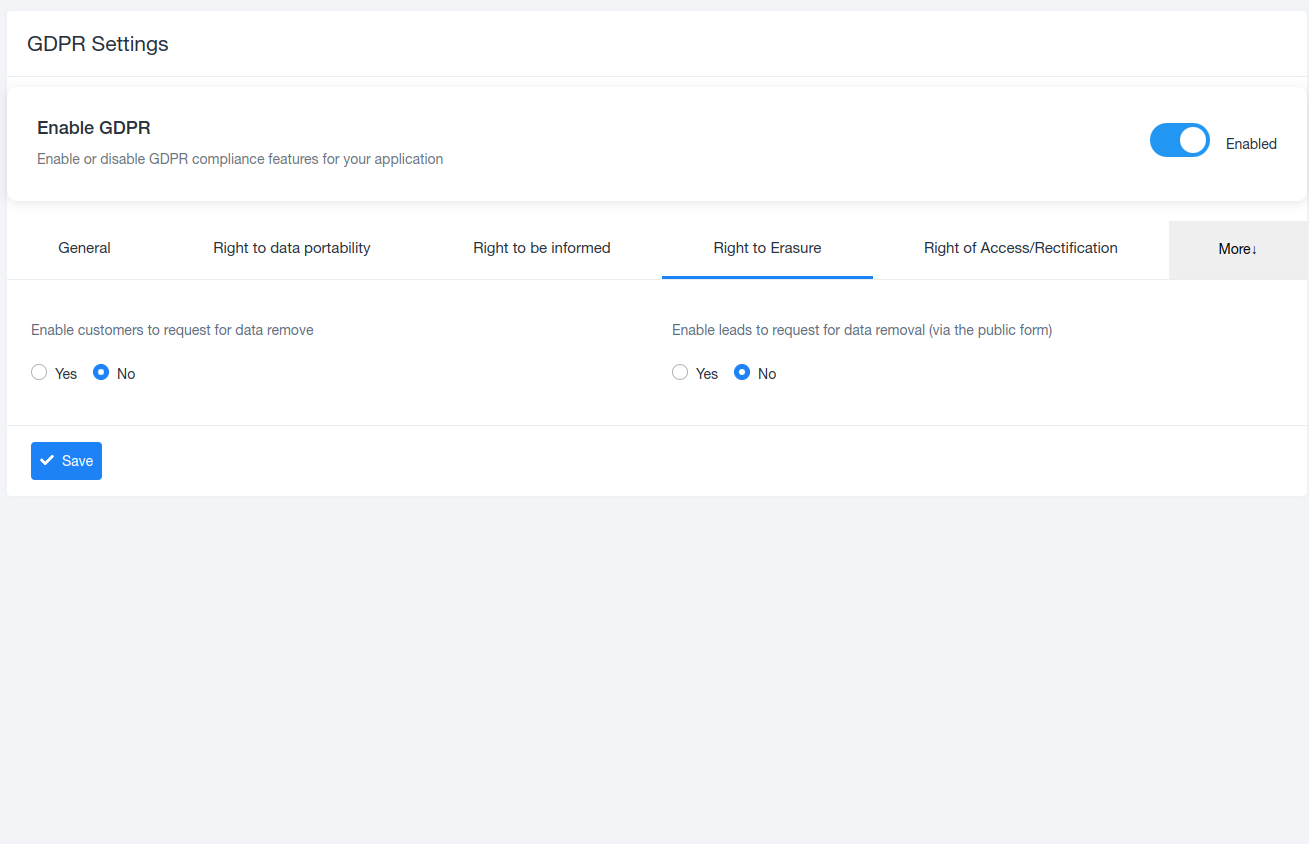 We’ve updated the GDPR Settings to give administrators greater control over data privacy while ensuring full compliance with GDPR requirements. These settings help organizations manage how customer and lead data is collected, displayed, accessed, exported, updated, and removed—directly from the application.