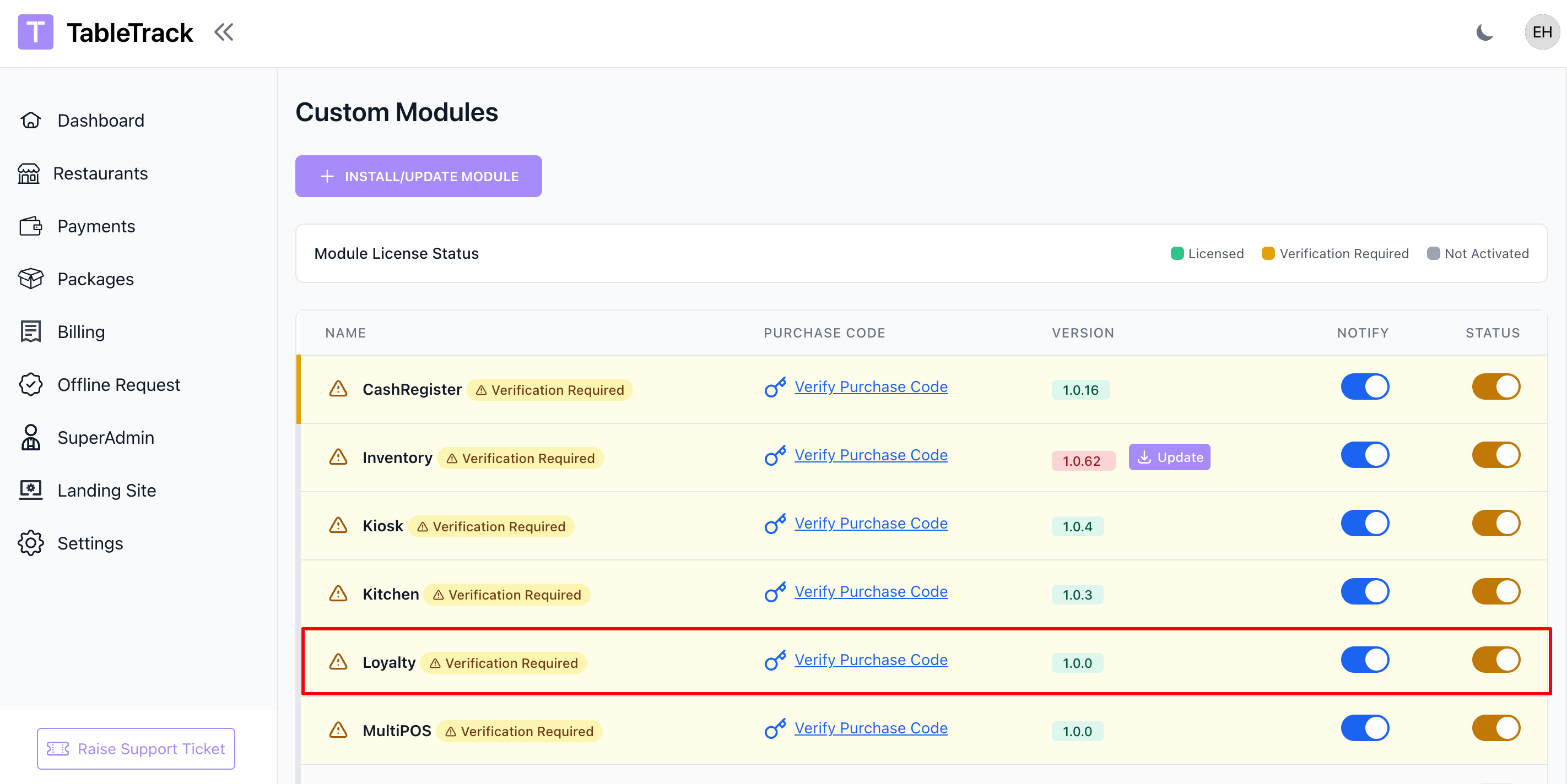 - Open Superadmin Panel -> Custom Modules -> Loyalty
