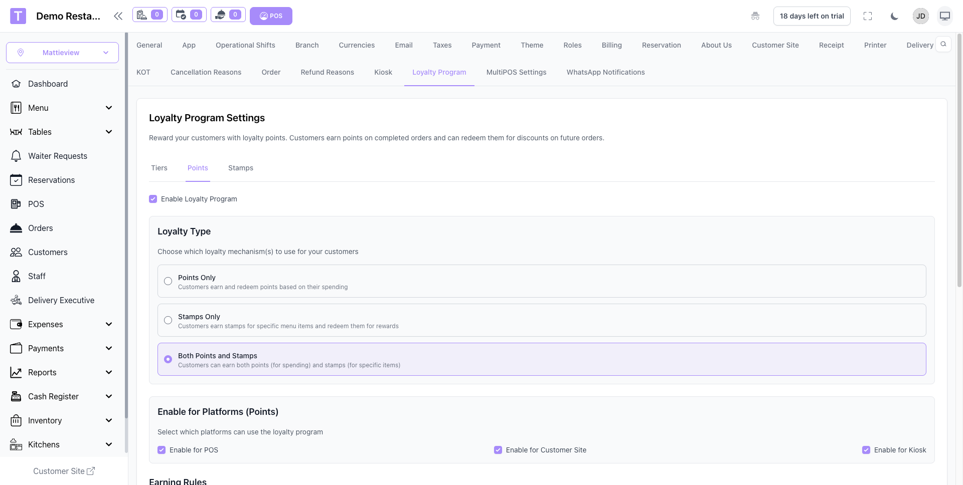 The Loyalty & Rewards Module helps you build repeat business by rewarding customers with points and stamps. It supports flexible earning rules, tiered benefits, and redemption options across POS, Customer Site, and Kiosk.