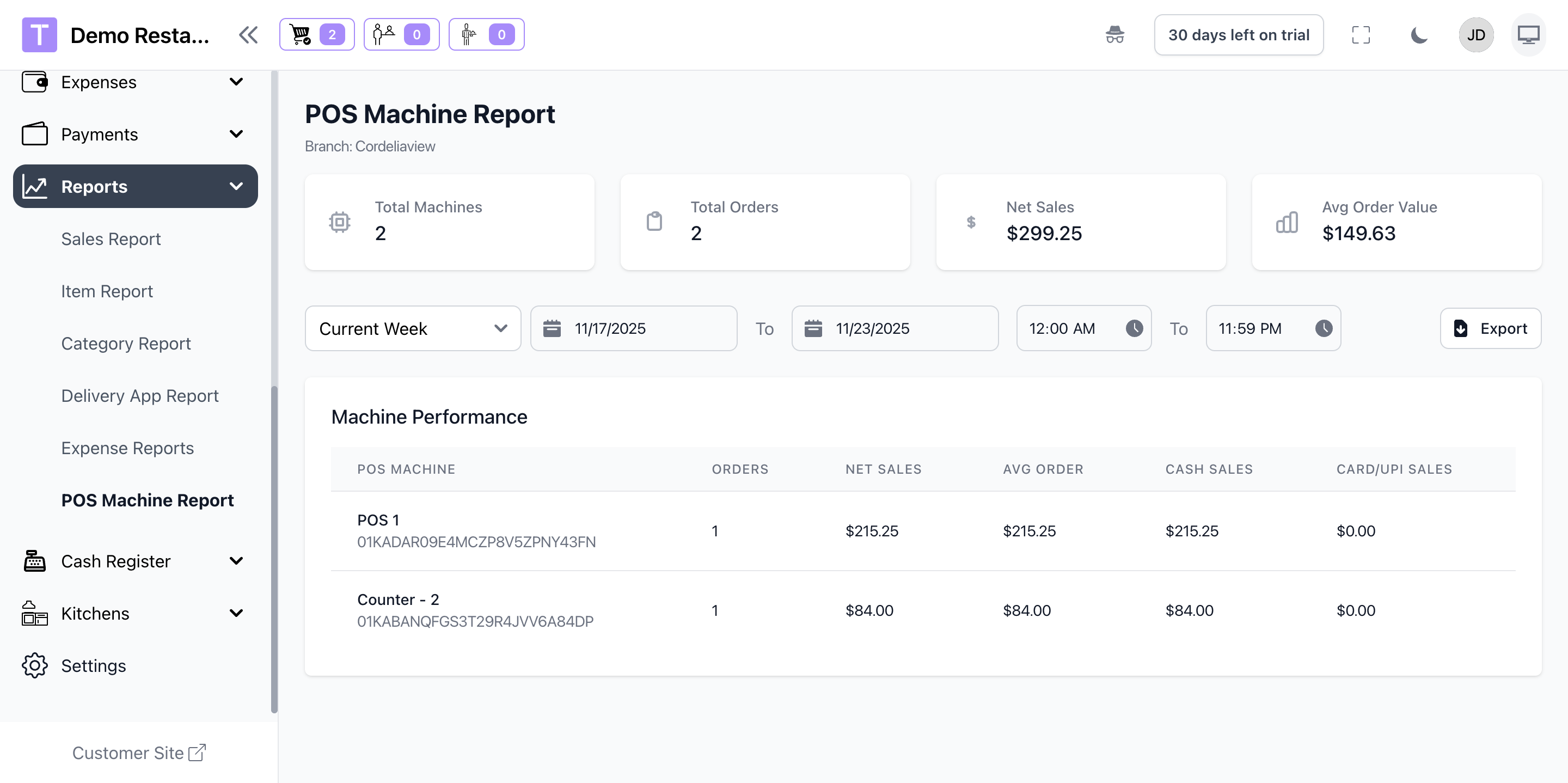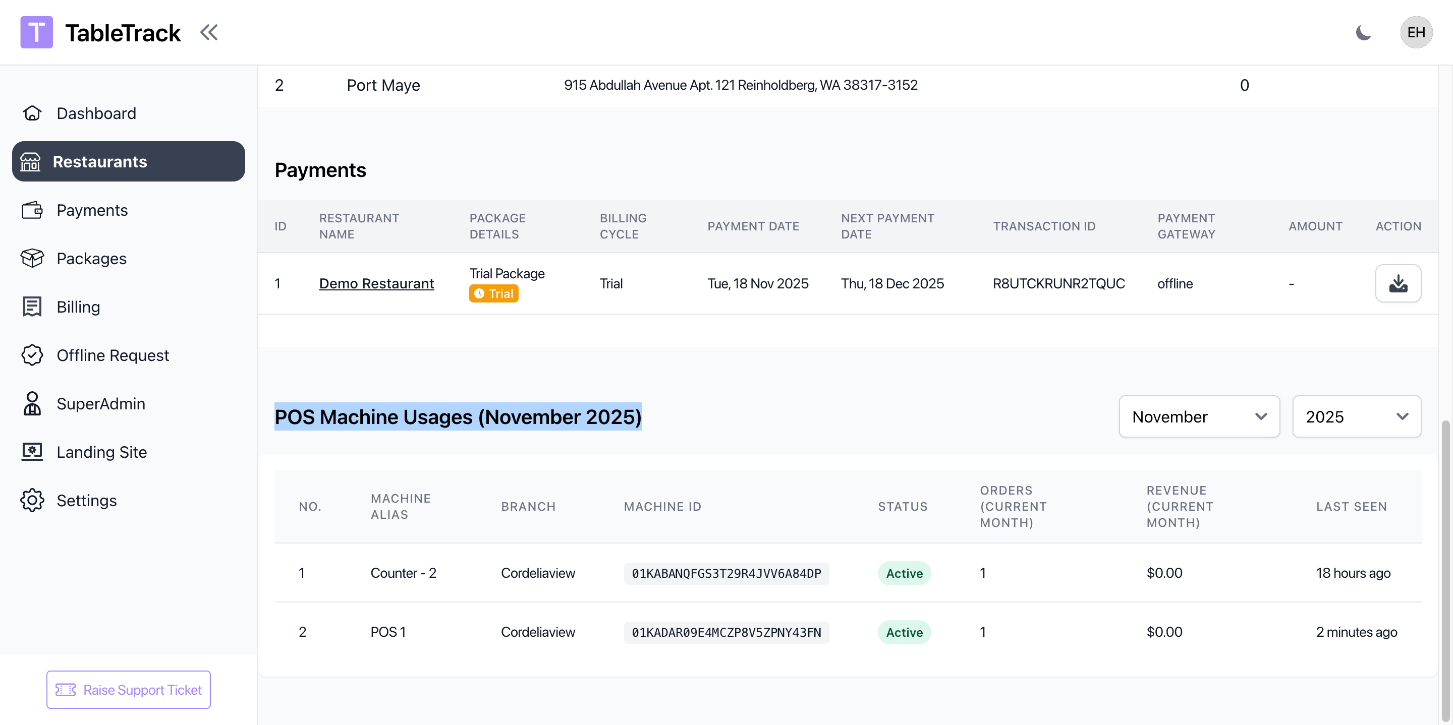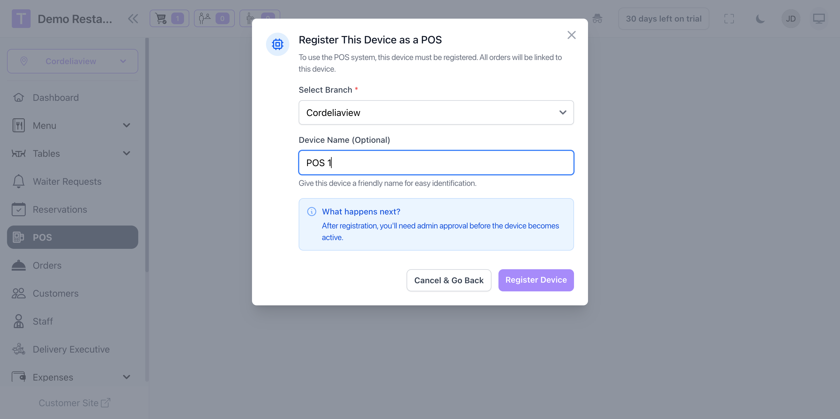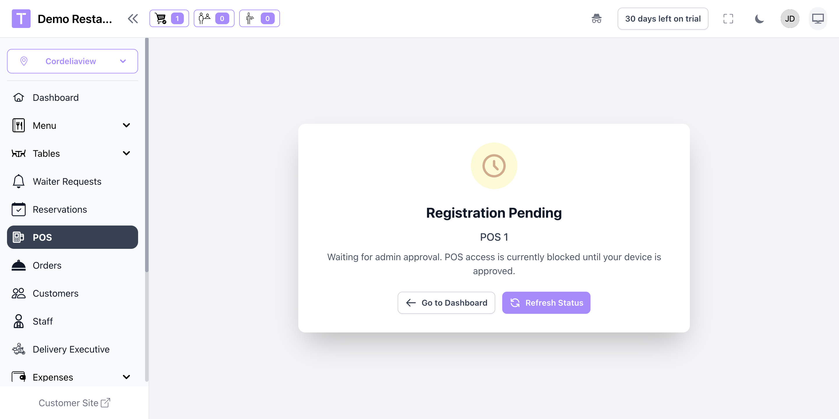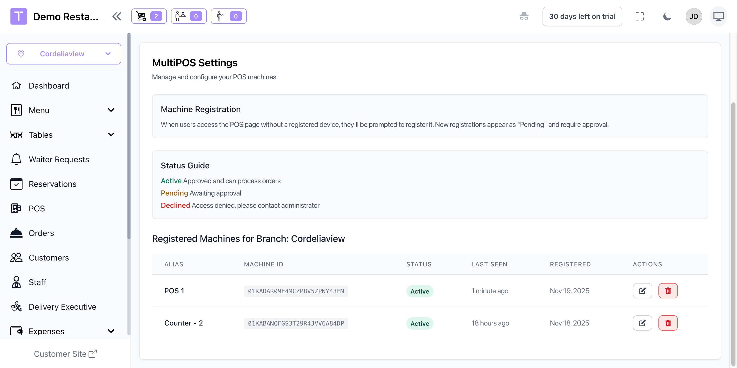 The MultiPOS Module lets restaurants register and manage multiple POS devices from one centralized dashboard. Orders, tables, and payments stay synchronized across devices in real time.