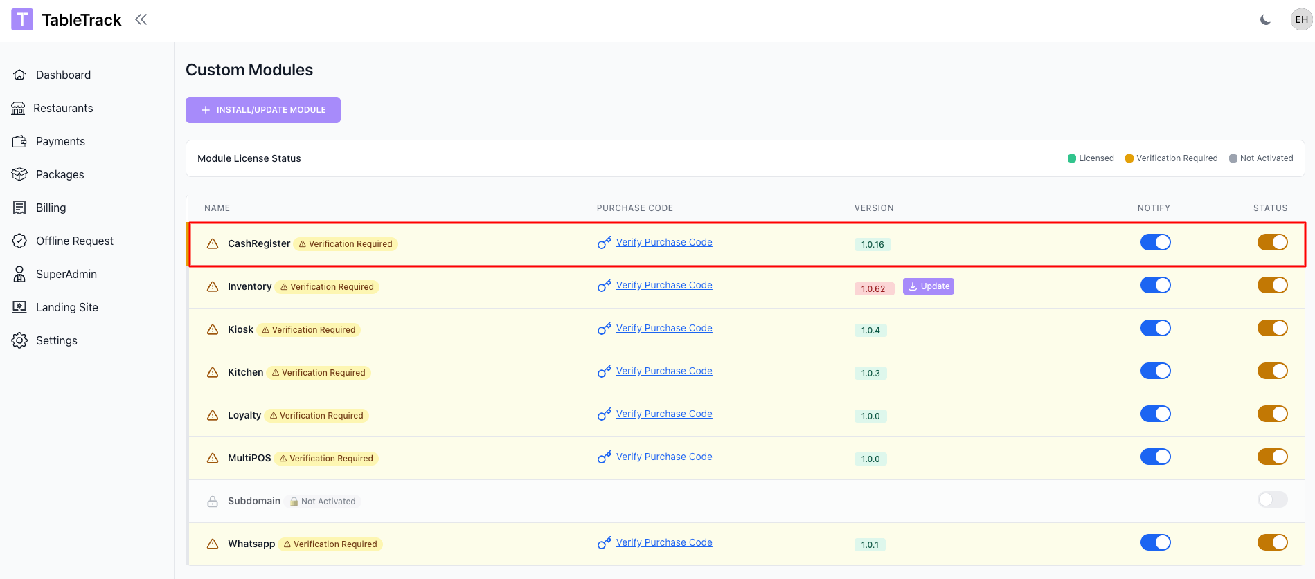 - Open Superadmin Panel -> Custom Modules -> Cash Register