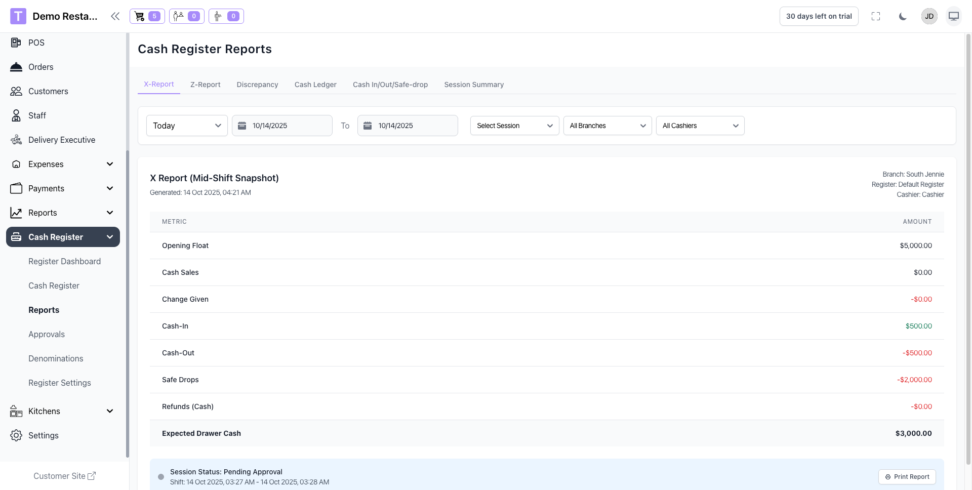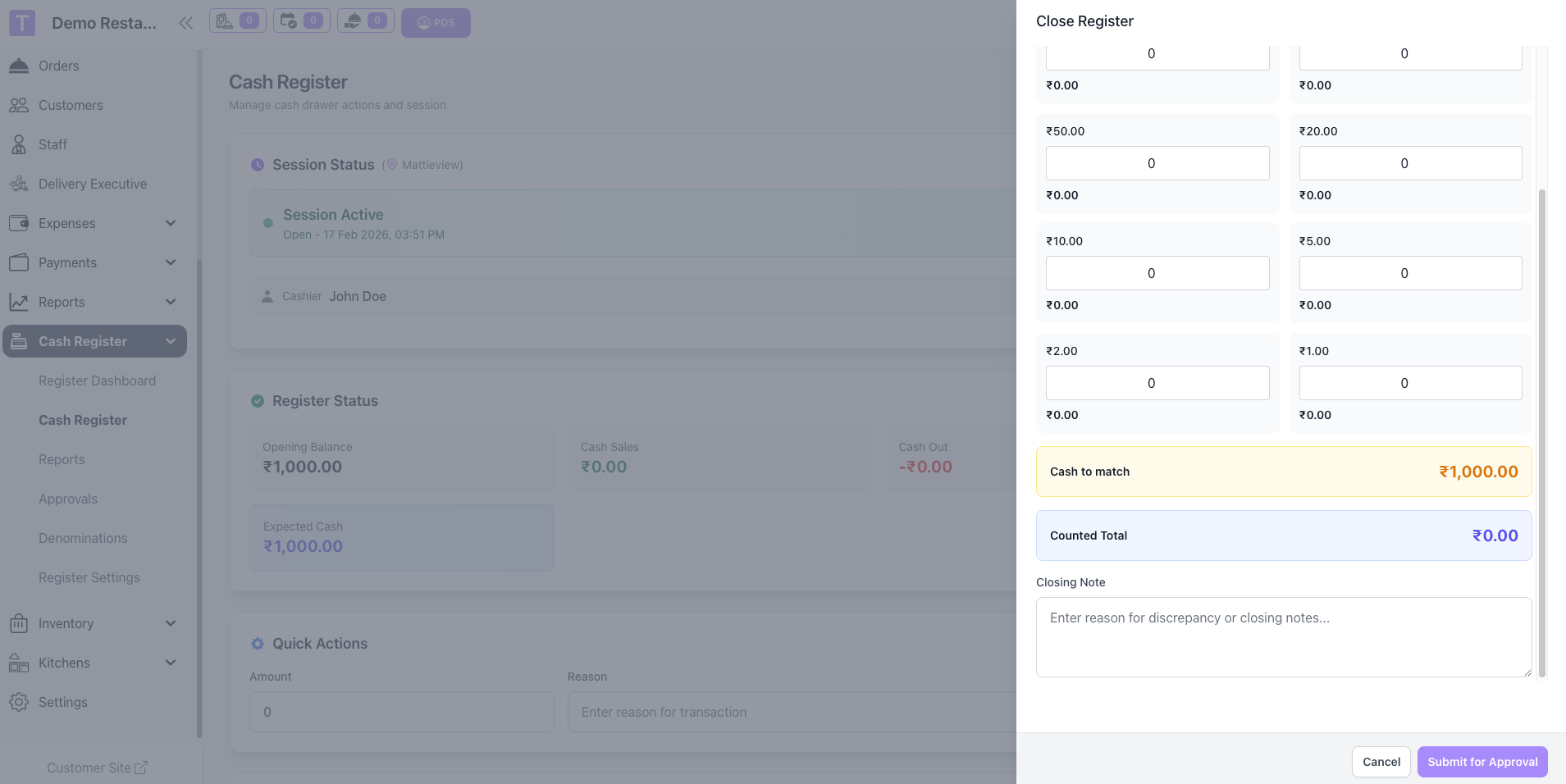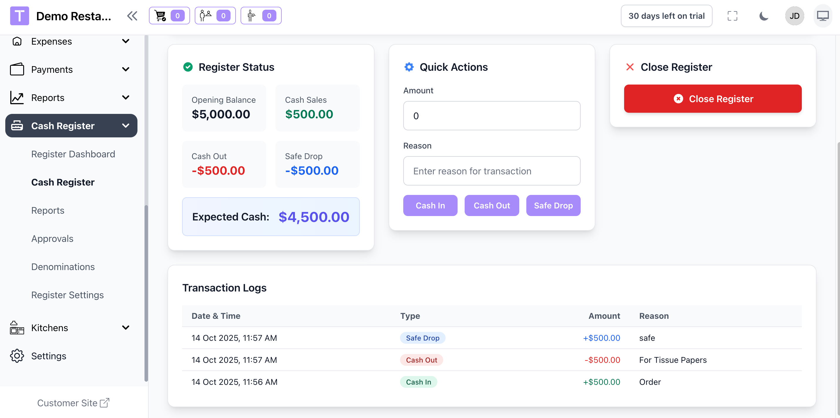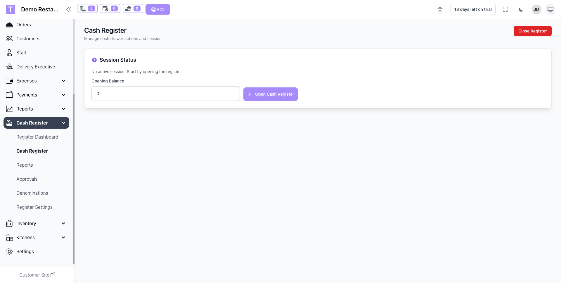 The Cash Register Module provides comprehensive drawer management for restaurants. Track opening and closing balances, cash denominations, cash in/out events, and shift reports while keeping a clear audit trail for every cashier.