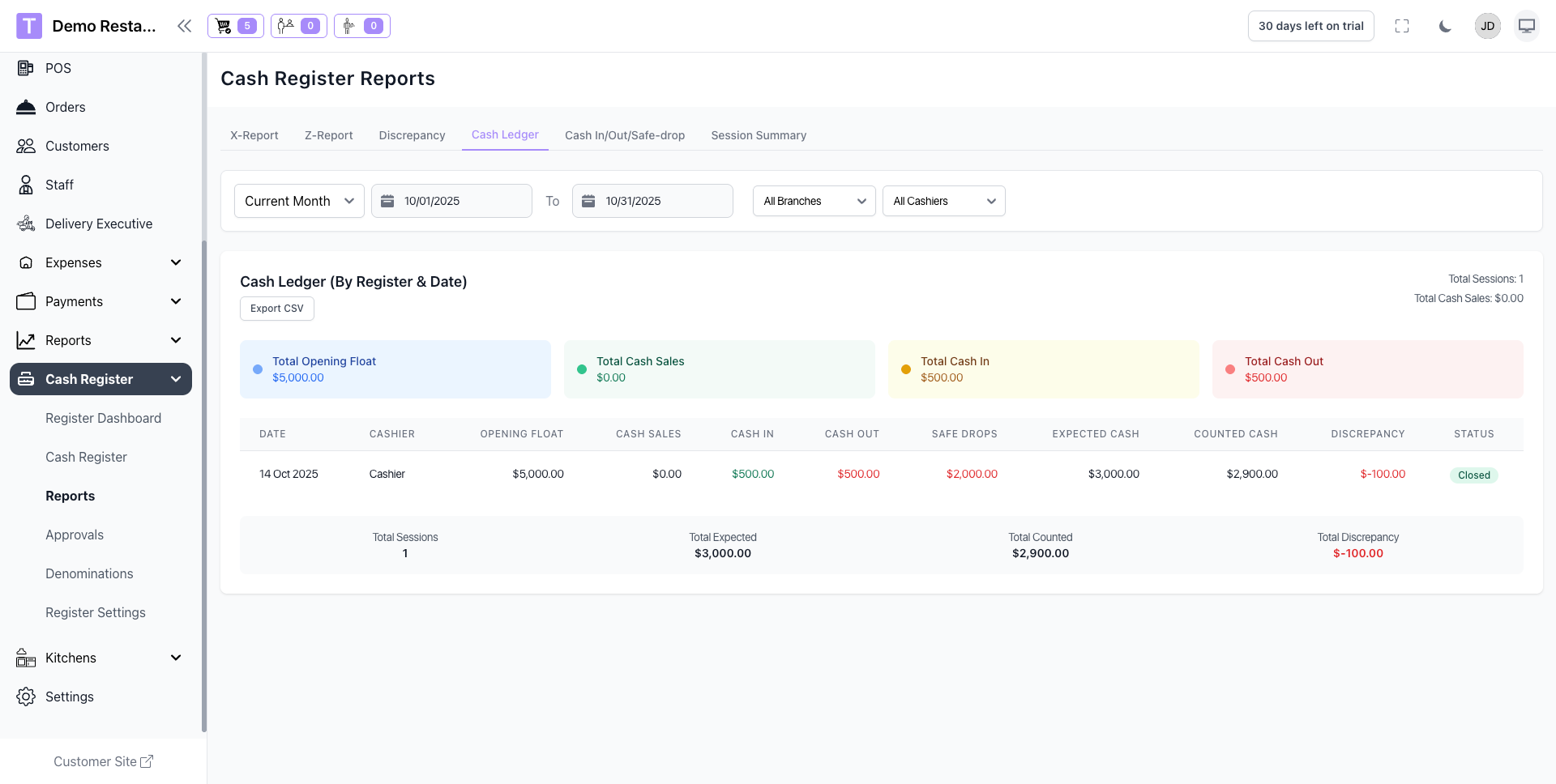 - Cash Movement Log: Cash in/out history with reasons and staff names.