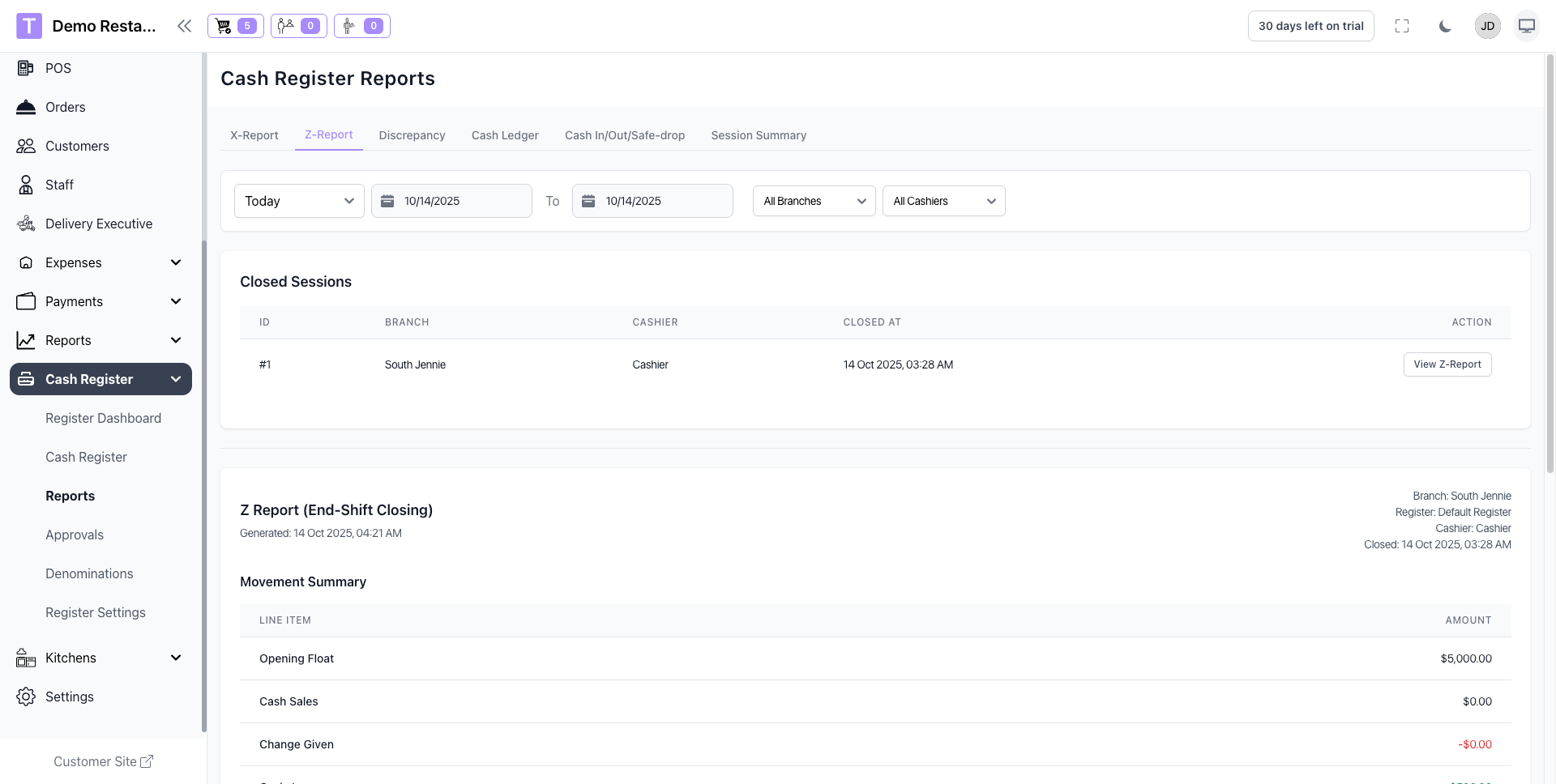 - Z-Report: End-of-shift report that closes the register and locks totals.