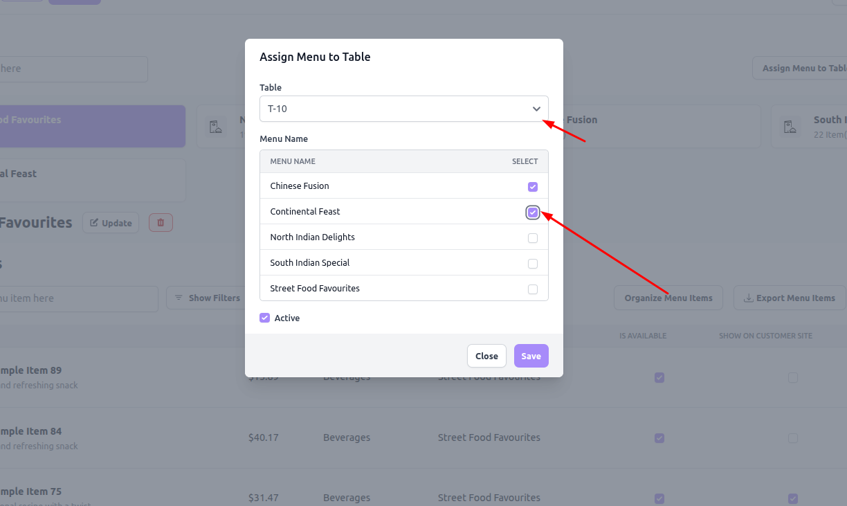Admin checks the menu items that should be visible for that table.