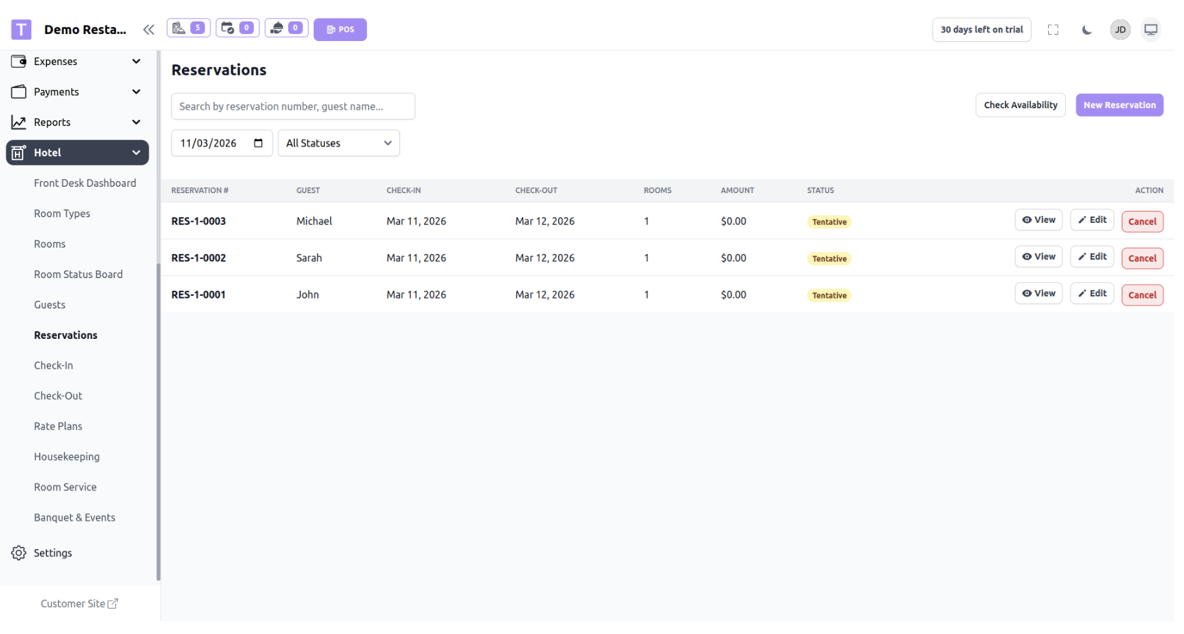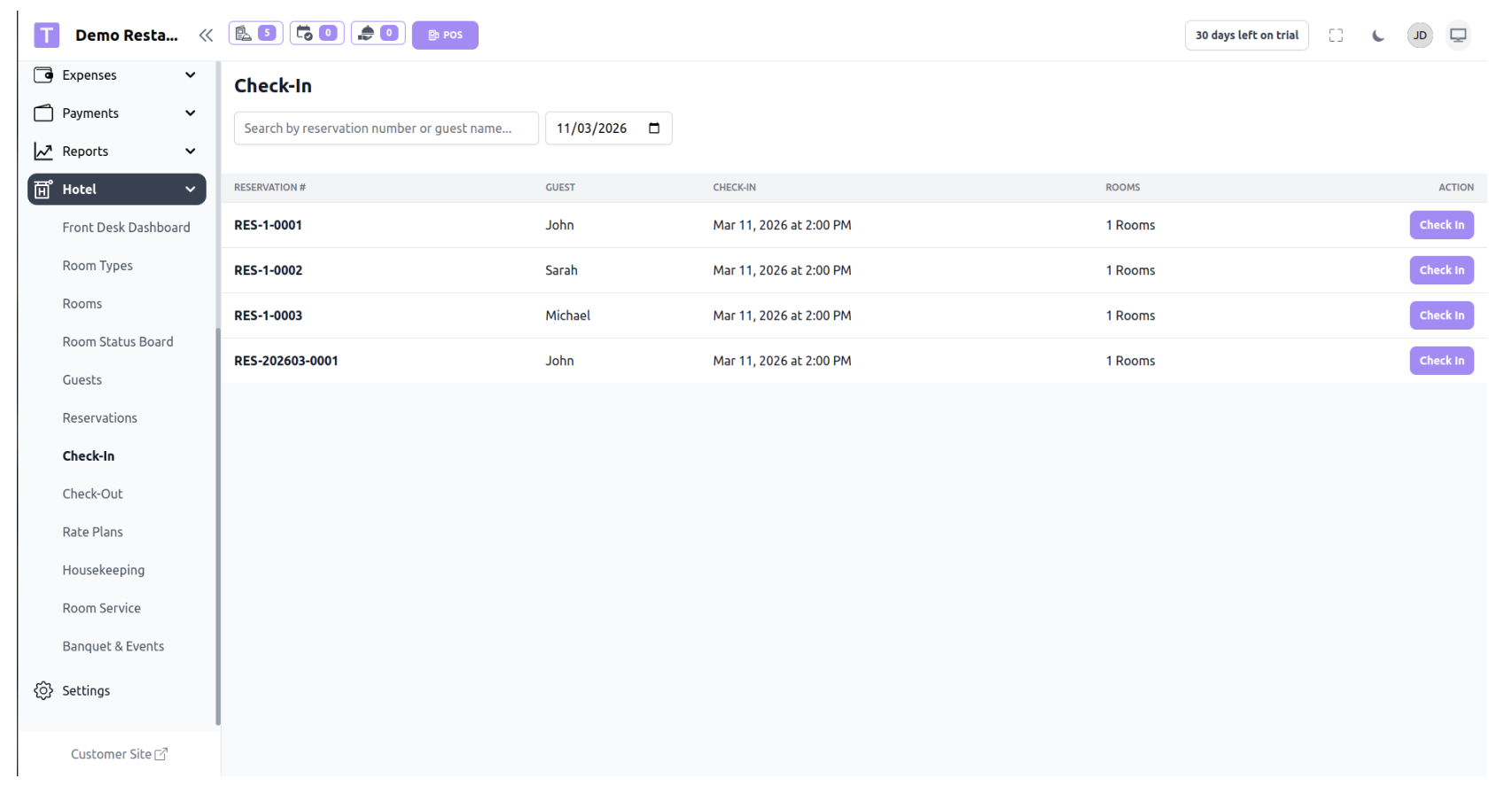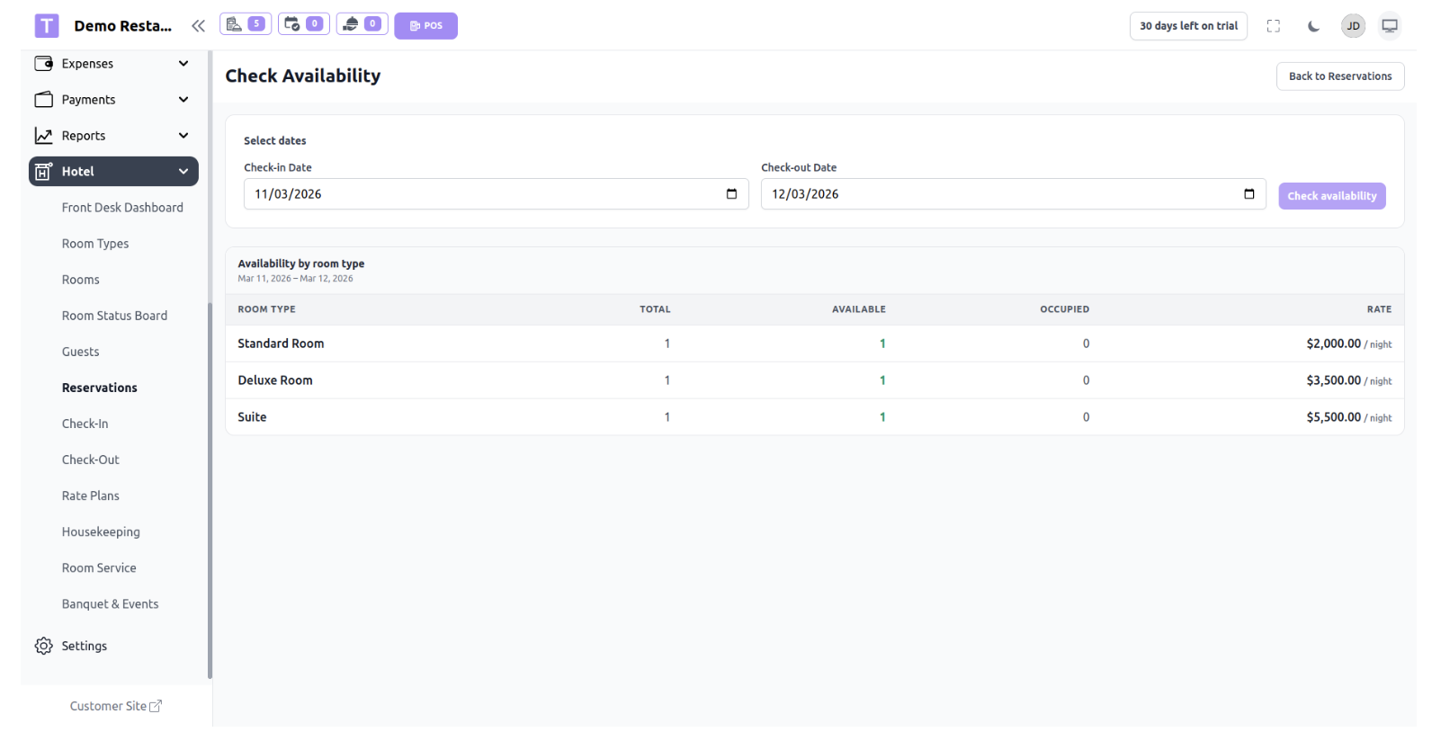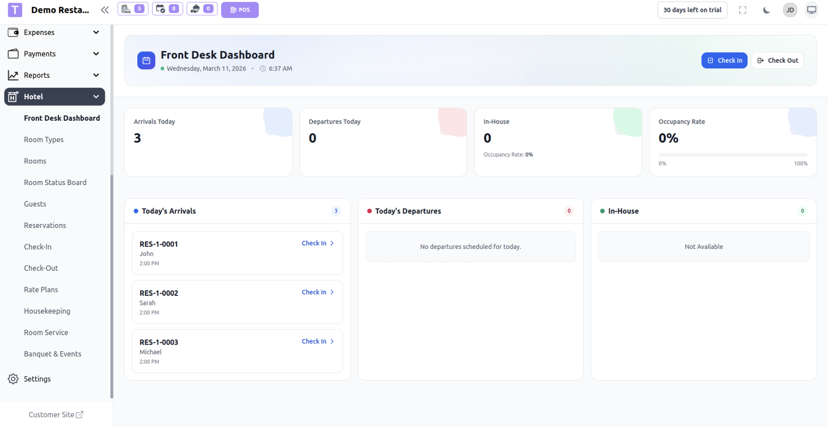 The Hotel Module allows restaurants to manage hotel rooms, reservations, guests, and front desk operations from within the same system. This module is designed for restaurants or hospitality businesses that also provide accommodation services.