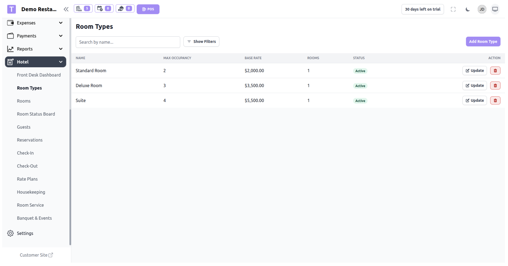 The Room Types section allows administrators to create and manage different categories of hotel rooms. Each room type defines the room capacity and base price.