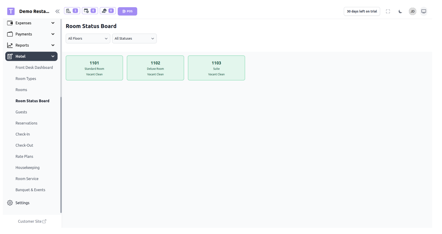 The Room Status Board provides a visual overview of all rooms and their