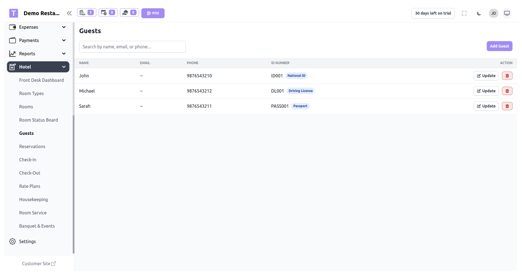 The Guests section stores and manages information about all hotel guests.