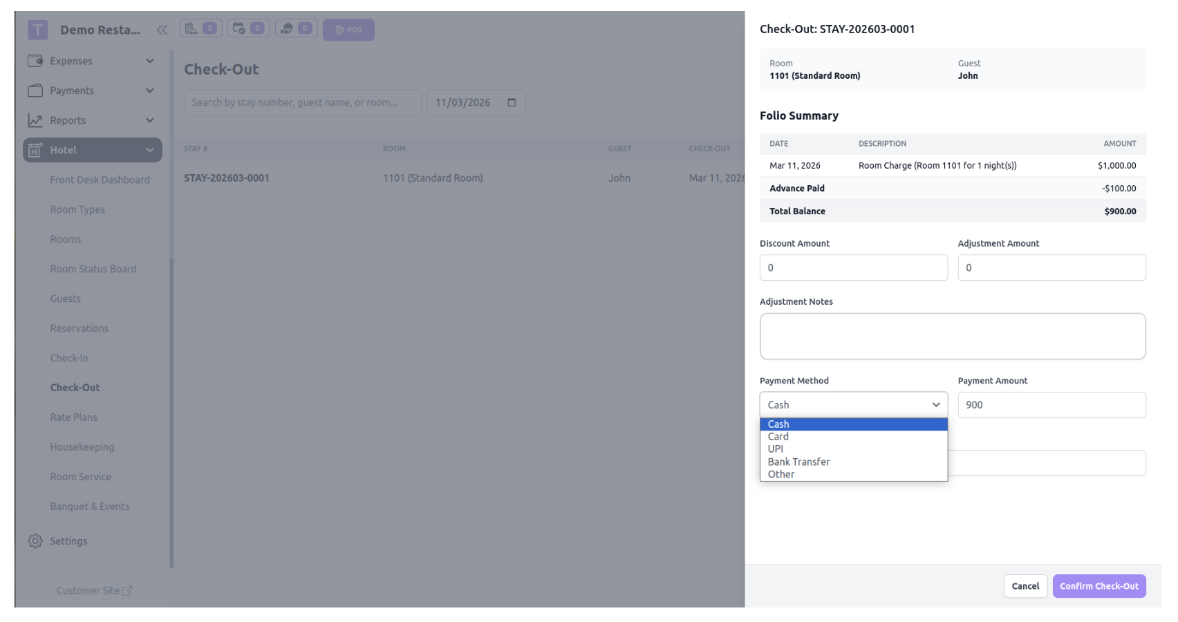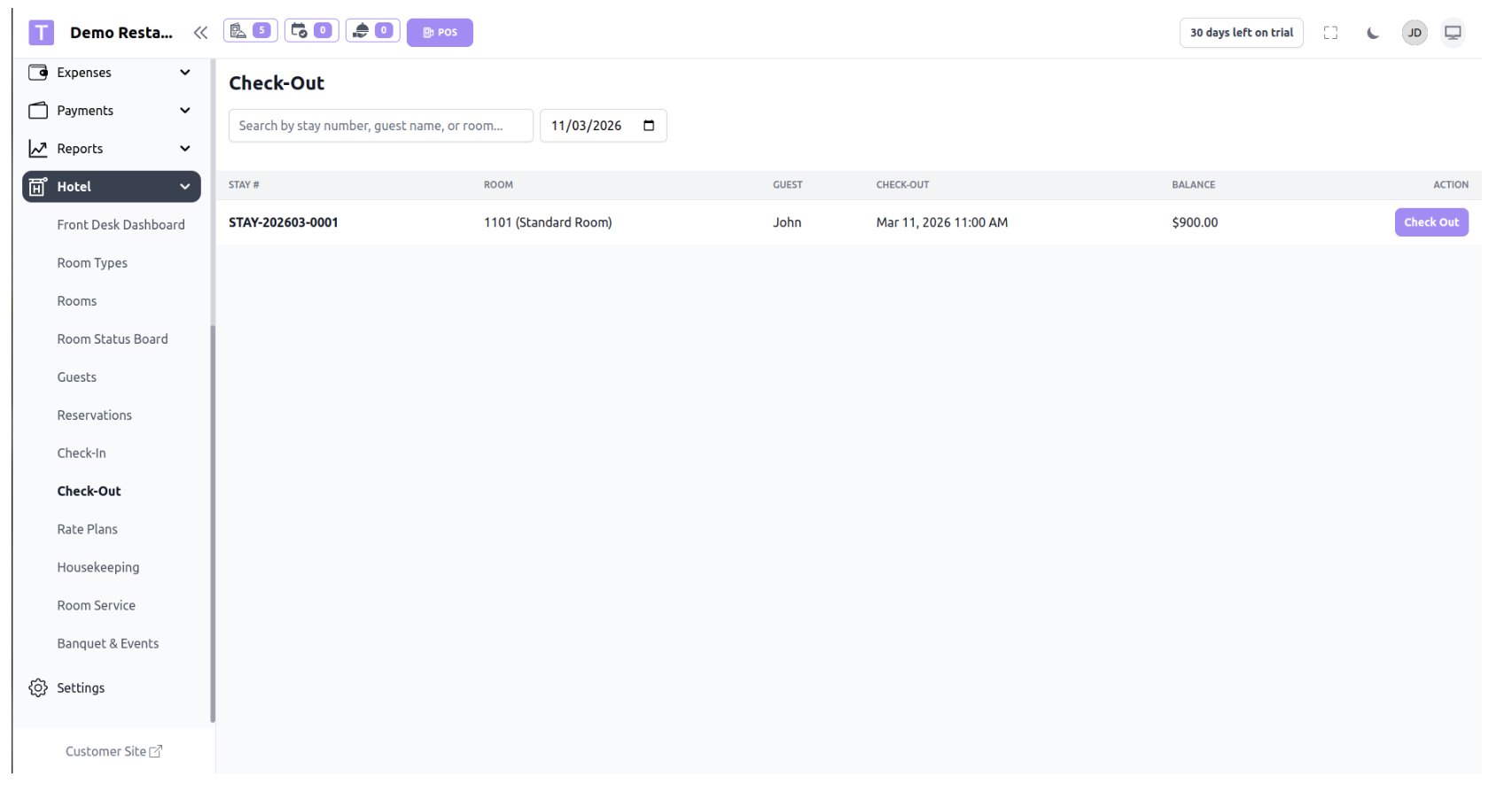 Check-Out is performed when a guest leaves the hotel. During this process, staff opens the Check-Out page, selects the guest or reservation, reviews the stay details, completes any pending payment, and confirms the check-out.