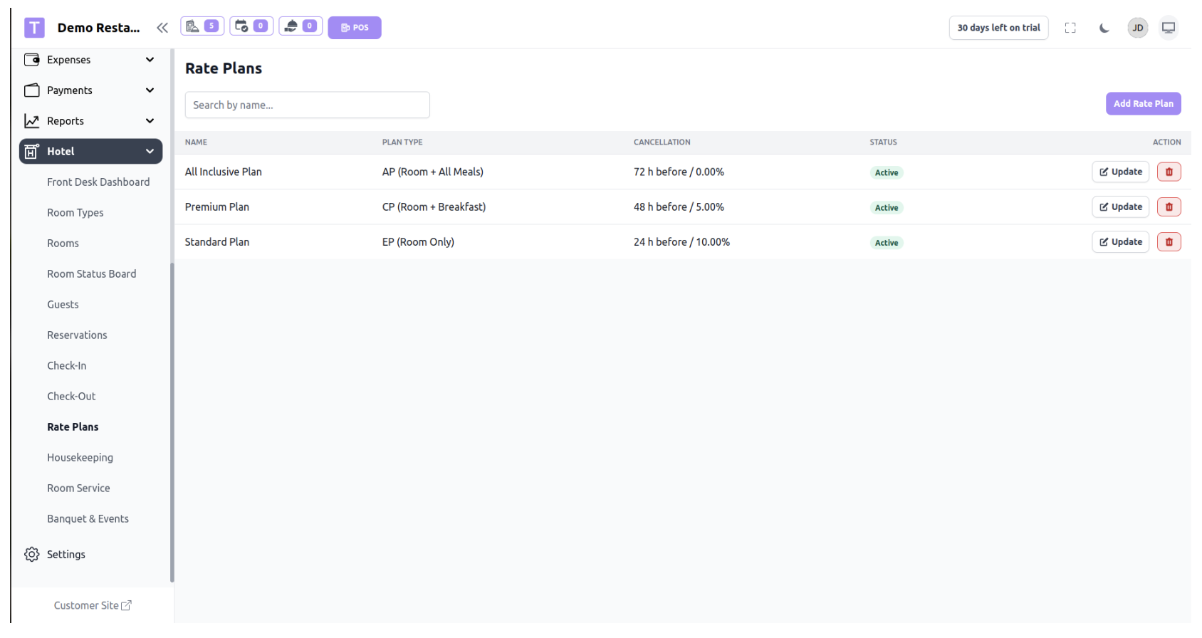 Rate plans help hotels manage flexible pricing such as seasonal pricing, promotional rates, or special offers.