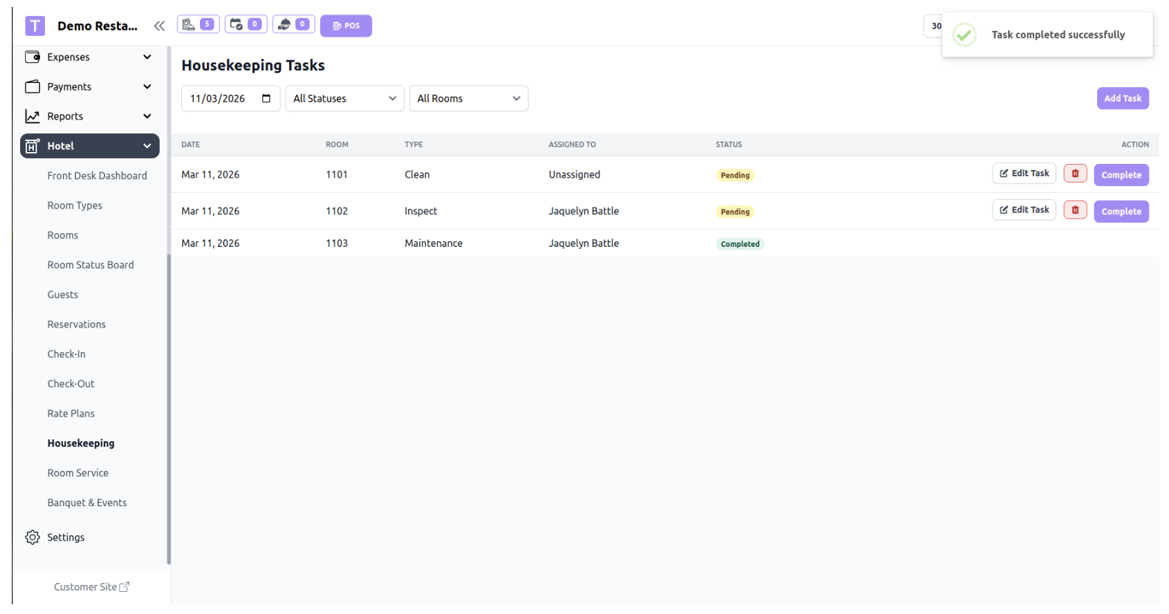 The Housekeeping Task feature helps manage room cleaning and maintenance after a guest checks out.
