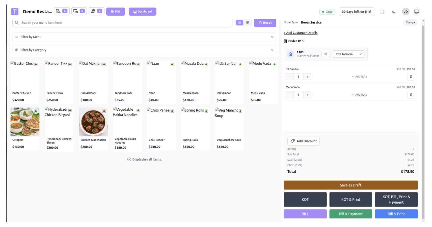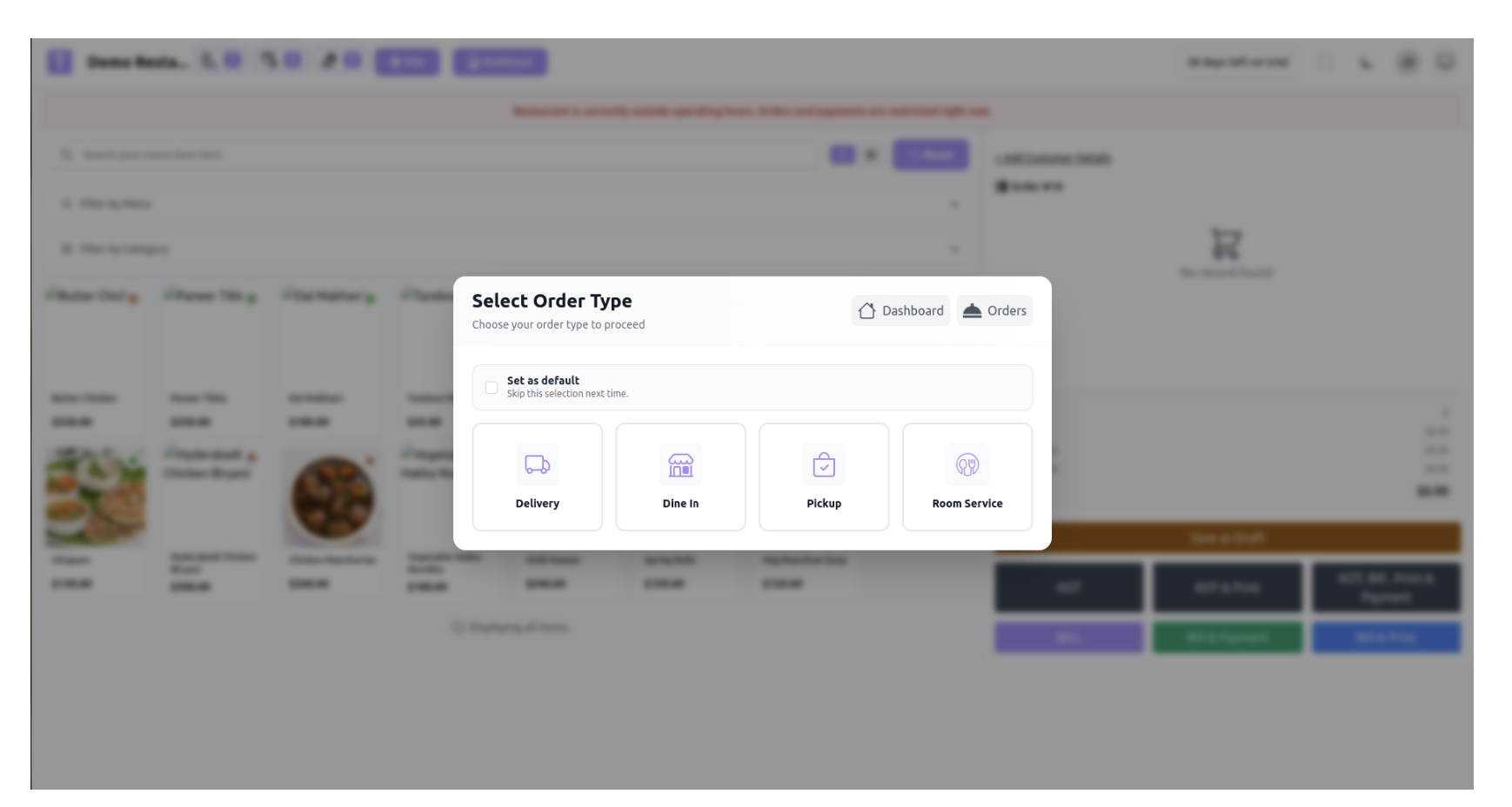 3. In the POS, staff selects Order Type → Room Service.