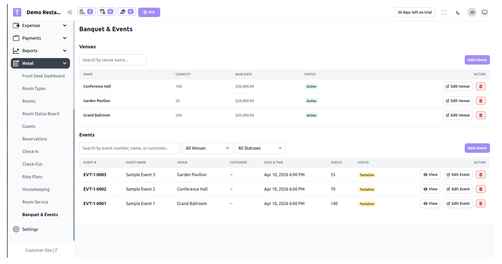 The Venue feature allows the hotel to manage different spaces or halls where events, meetings, or functions can be organized. Venues can include banquet halls, conference rooms, party halls, or outdoor spaces.