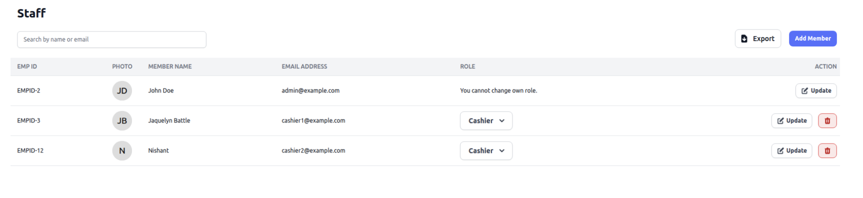 Add new staff members with required details and assign them to roles.