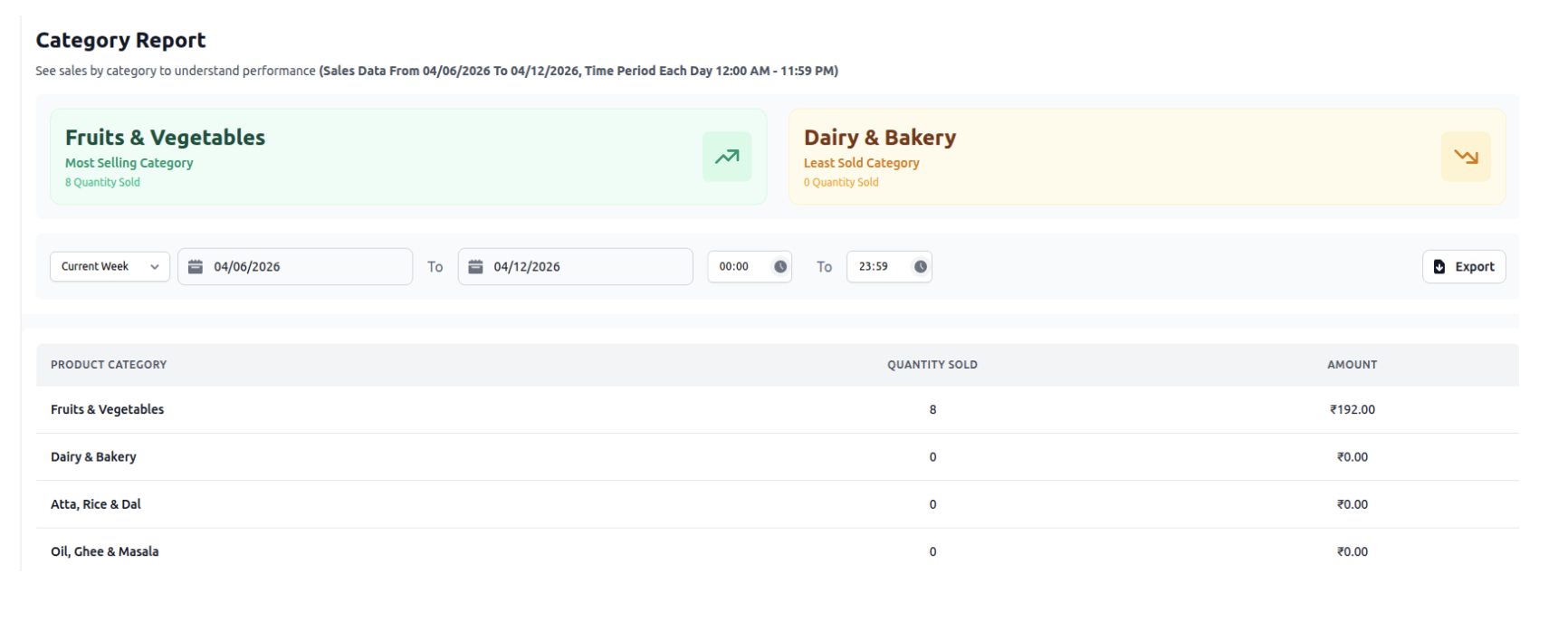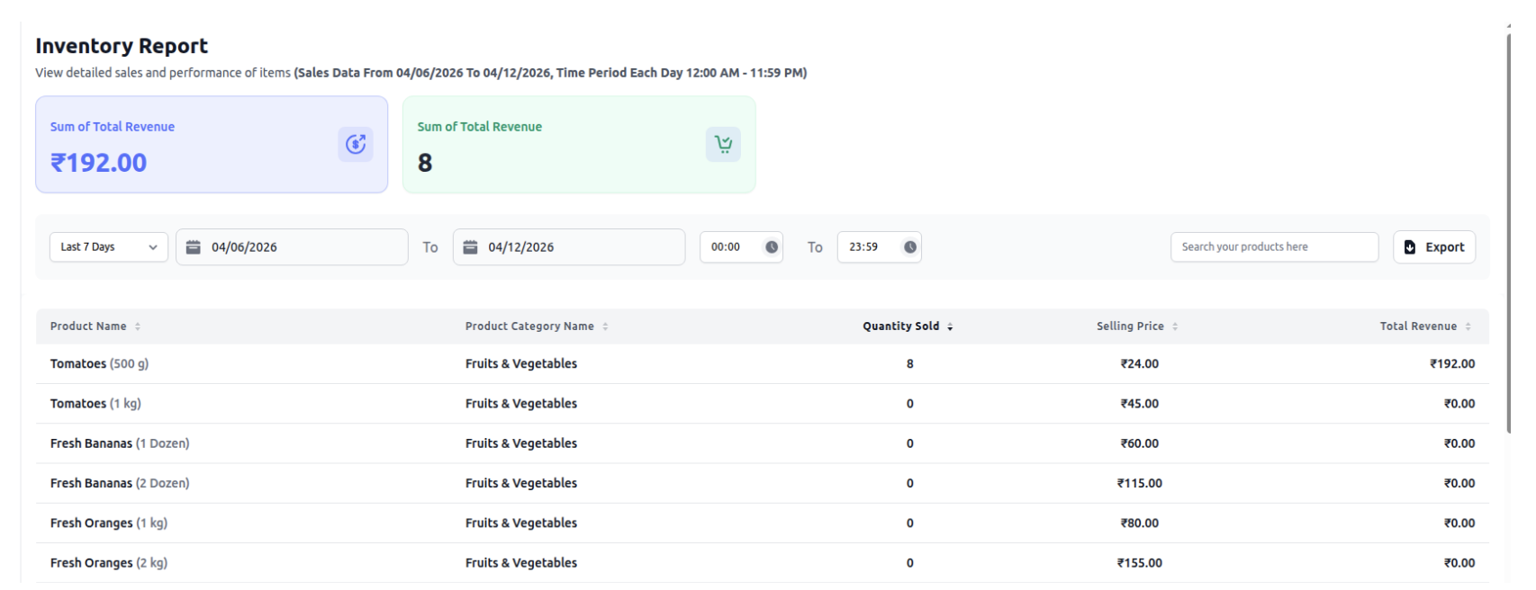 Displays current stock levels and product-wise inventory status.