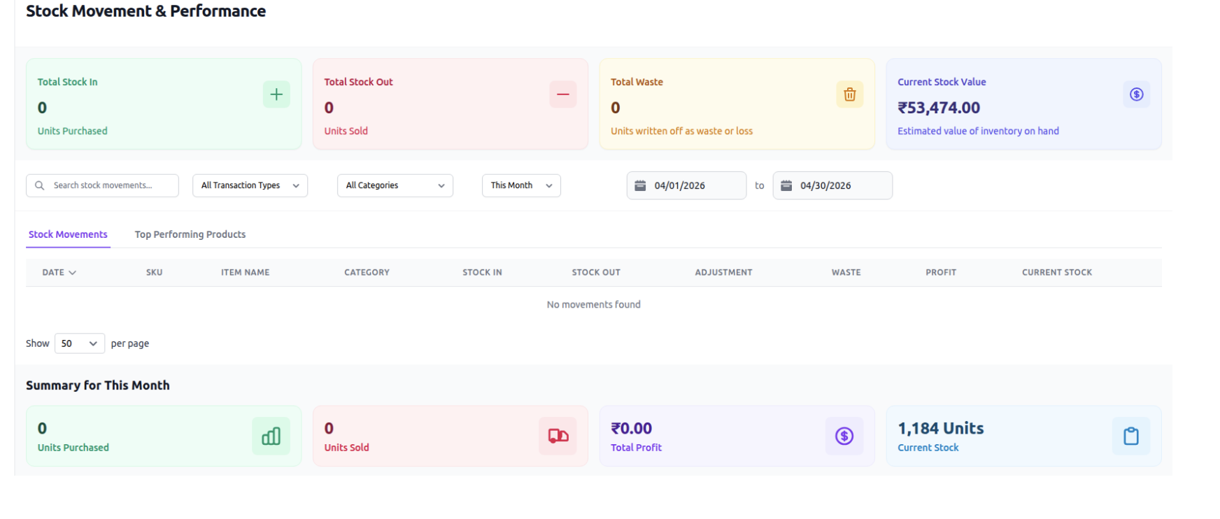 Tracks stock in and out, including wastage and overall stock performance.