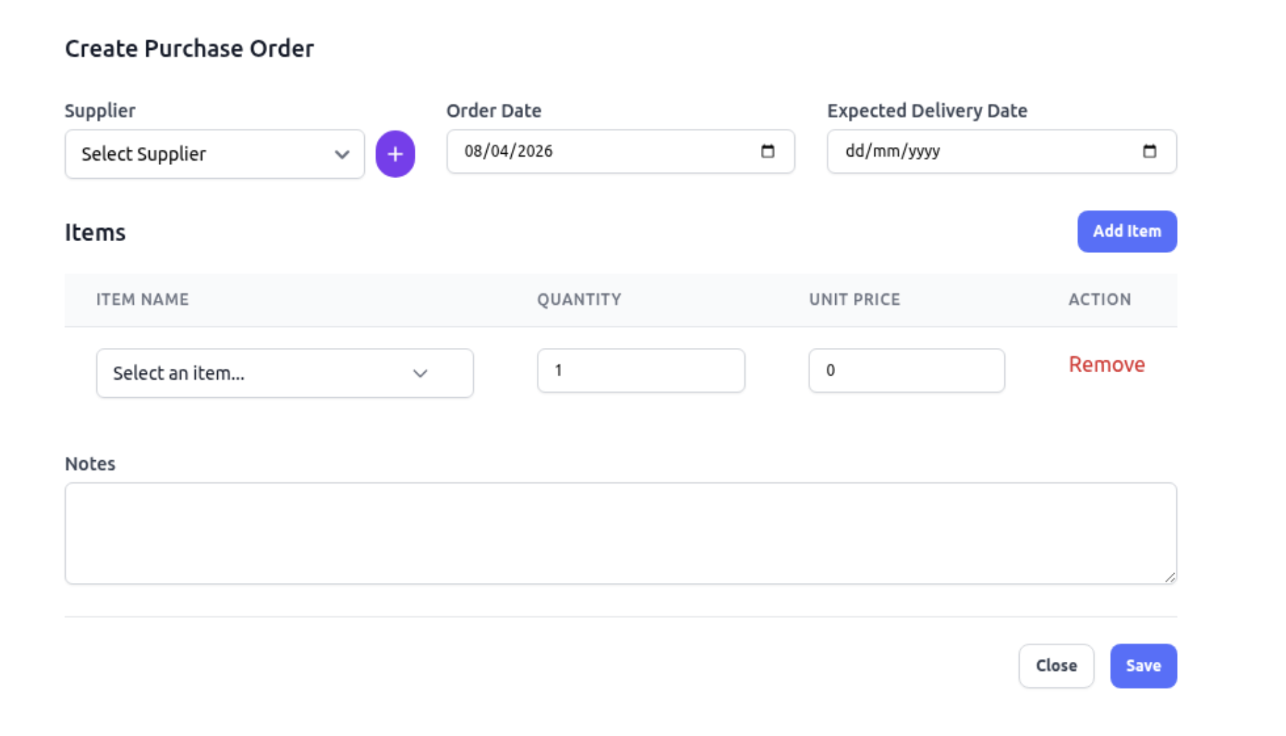 Suppliers can also be added while creating a purchase order. From the “+” icon beside “ select supplier”